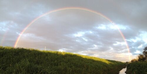 台風一過の昨日の夕方、いつもの散歩コースに歩きに出ました。出会ったのが見事な虹。 こんなきれいなアーチは生まれて初めて見たんじゃないでしょうか。行きあった人たちは、みな足を止めて写真を撮っていました。言葉を交わした方が三人。
