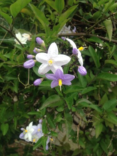 自転車で近所を走っていたら、フェンスにからめたツル植物がきれいな花を咲かせていました。ツルハナナス(蔓花茄子)というらしい。 なんとも涼やかな色のとりあわせに、思わず自転車を止めてパチリ。たしかに、ナスの花に似ているなあ。つぼみの紫から、ひ…