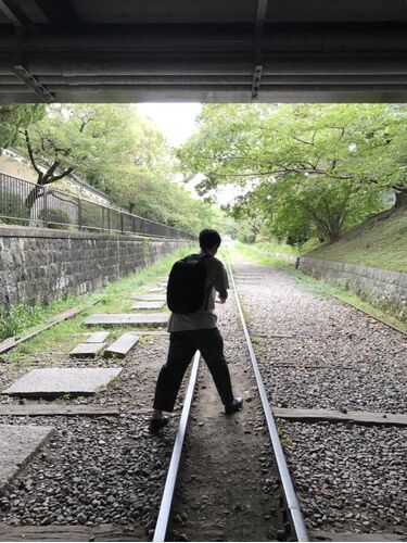 「スタンド・バイ・ミー」 琵琶湖疏水への船の上げ下ろしをしていたという軌道、インクラインの跡。後ろ姿は息子です。