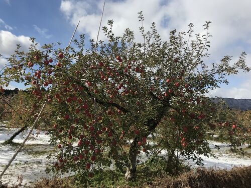 少し前のことですが、群馬にて。雪とりんご。 なぜか摘果されていませんでした。なぜなんでしょう? もう十分に熟れていると思うのですが。
